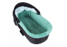 Vložka má po stranách gumičku a zapínanie na bokoch, vďaka čomu je univerzálny a hodí sa pre väčšinu kočíkov.