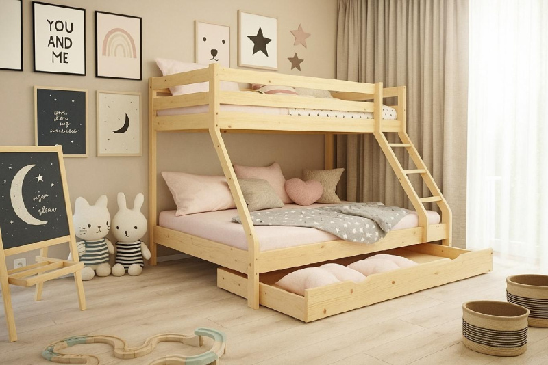 Táto zaujímavá poschodová posteľ je vyrobená z masívu borovice a slúži ako posteľ pre dve až tri osoby. Horná posteľ má rozmer 90x200 cm a spodnú posteľ 140x200 cm. Sila použitého masívu, zaisťuje pevnú a stabilnú konštrukciu. Celý popis produktu