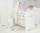 9. Príborník - praktický doplnok na postieľku so 6 priestrannými vreckami, čím poskytuje veľkú kapacitu. Pripevnenie 3-mi šnúrkami k postieľke. Z vnútornej strany má načechranú netkanú textíliu, vyrobené z rovnakej farebnej kombinácie ako ostatné diely sady.