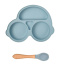 Silikónový tanier v tvare auta delený na segmenty a lyžička s drevenou rukoväťou.