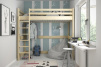Jednolôžko na medziposchodí. Určené predovšetkým pre tých, ktorí nemajú vo svojom byte veľa miesta. Pri použití medziposteľa sa nemusíte vzdávať veľké postele, priestor pod ňou môžete využiť ľubovoľne. Rozloženie izby zobrazenej na fotografii je iba jedným z nespočetných možných usporiadaní priestoru pod posteľou. Vysoký priestor pod medziposchodím umožňuje umiestniť aj nízku šatníkovú skriňu.
