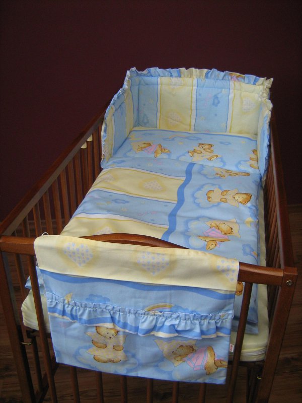 Táto súprava do postieľky sa skladá z týchto dielov: výplň vankúša, výplň perinky, návliečky na vankúš, obliečky perinky, príborníka na nevyhnutné vecičky, ochranného mantinelu siahajúceho tretiny postieľky. Materiály použité priCelý popis produktu